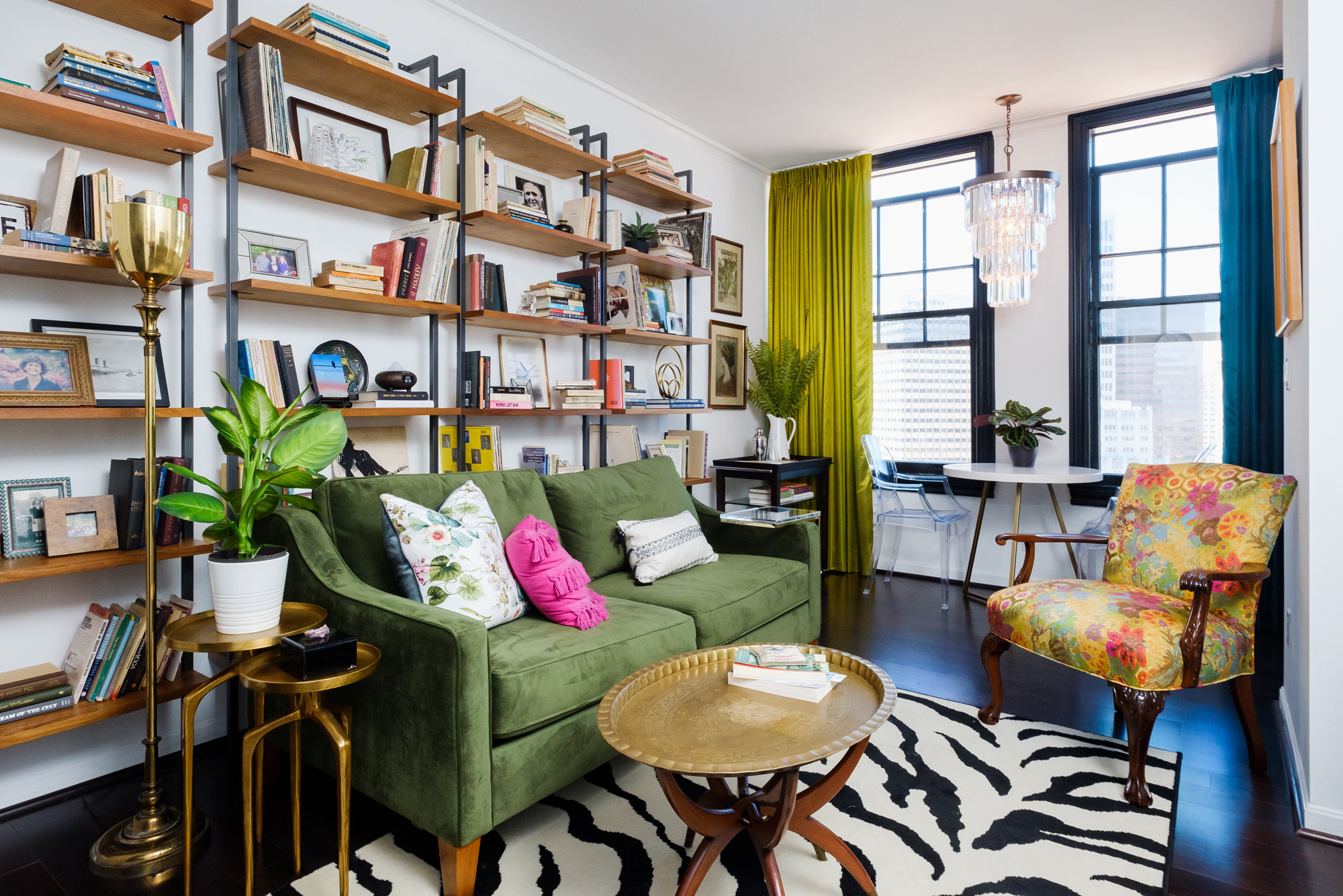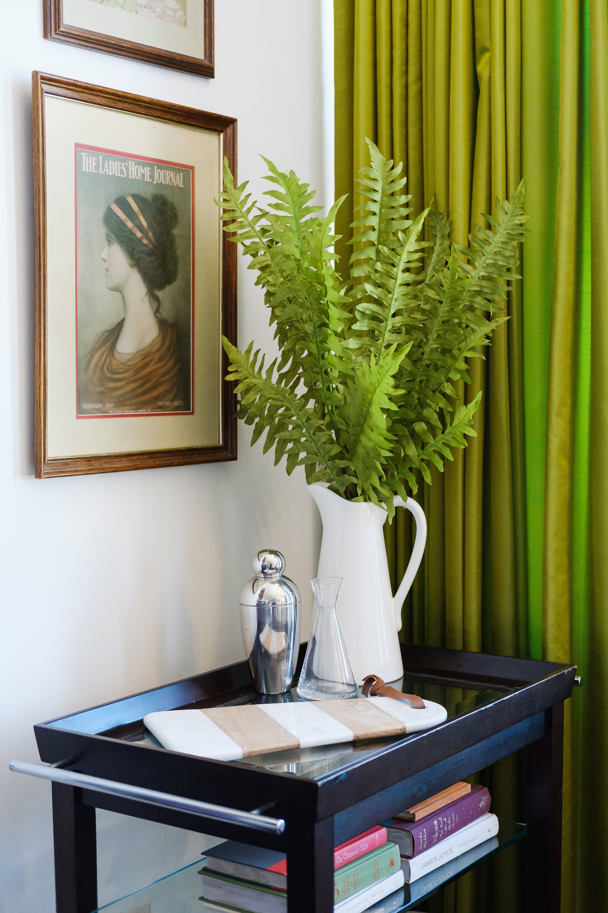 With a limited footprint in this small space, playing around with color packs a sophisticated punch. Adding two different color drapery panels, and maximizing tall ceilings, we used every available inch in this tiny condo for a result that feels spacious as well as functional. Work with what you have and make it amazing.